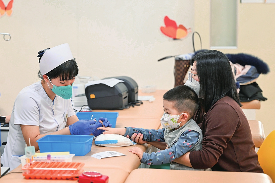 11月24日,在吉林大学第二医院儿科门诊,护士为患儿采血。(受访对象供图)