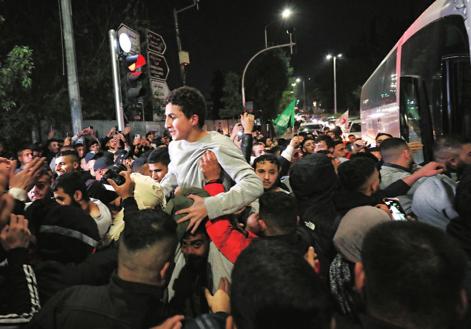 11月26日,在约旦河西岸城市拉姆安拉,人们庆祝被关押的巴勒斯坦人获释。据巴勒斯坦通讯社26日报道,以色列当晚释放了39名巴勒斯坦未成年人。新华社发(艾曼·诺巴尼摄)