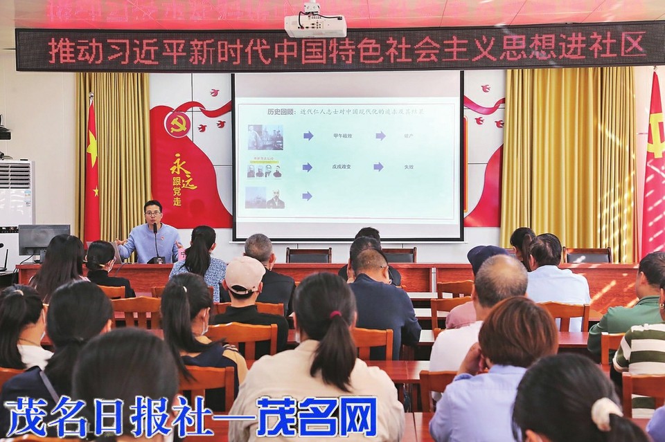茂名晚报讯记者陈琴昨日下午,由中共茂名市委宣传部、市民政局主办的“推动习近平新时代中国特色社会主义思想进社区”活动在茂南区河东街道岭咀社区举行。市委宣讲团成员、市委党校党建文史教研室主任宁其冲向社区干部群众全面讲述了“以中国式现代化全面推进中华民族伟大复兴”的相关内容。
