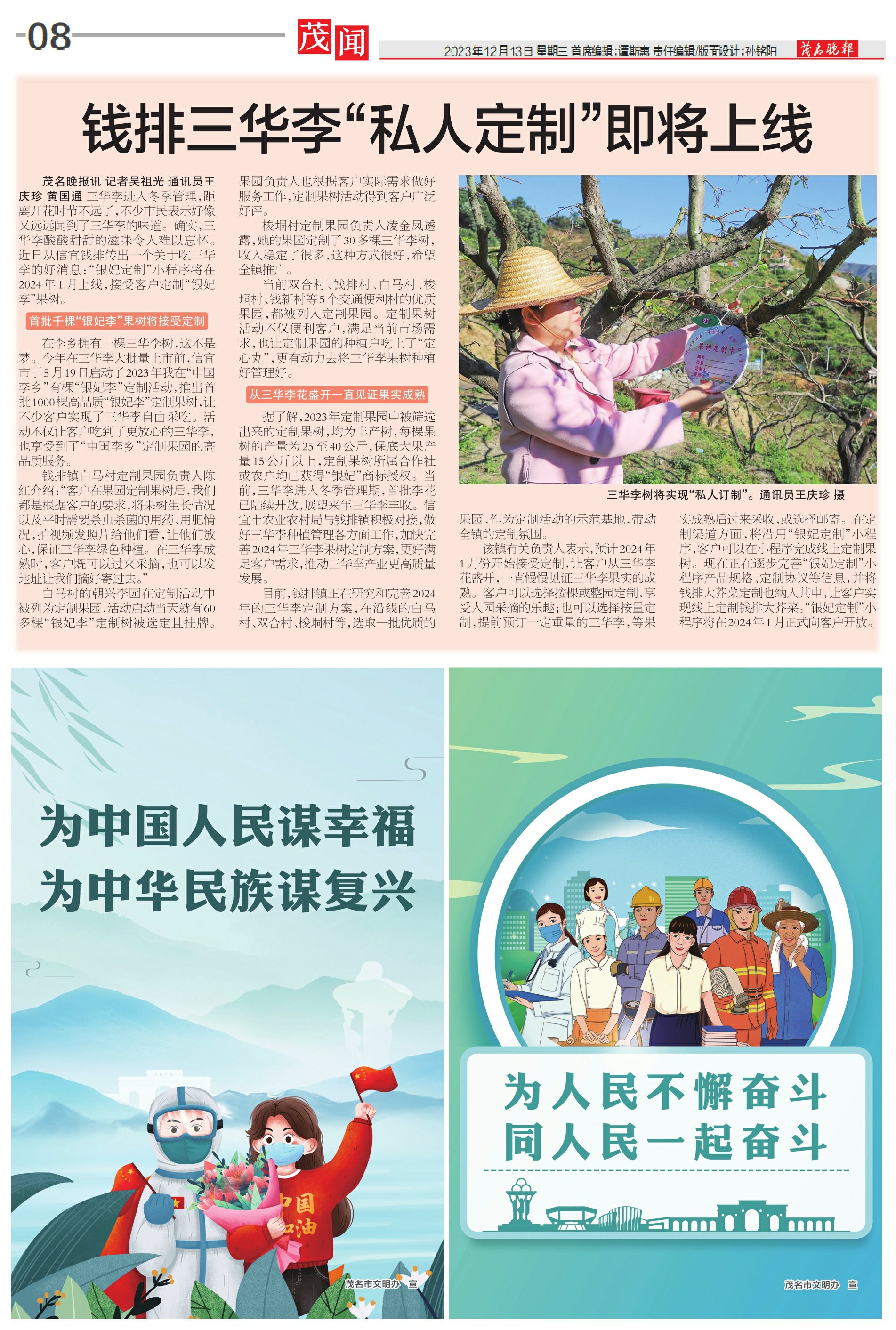 茂名晚报讯记者吴祖光通讯员王庆珍黄国通三华李进入冬季管理,距离开花时节不远了,不少市民表示好像又远远闻到了三华李的味道。确实,三华李酸酸甜甜的滋味令人难以忘怀。近日从信宜钱排传出一个关于吃三华李的好消息:“银妃定制”小程序将在2024年1月上线,接受客户定制“银妃李”果树。