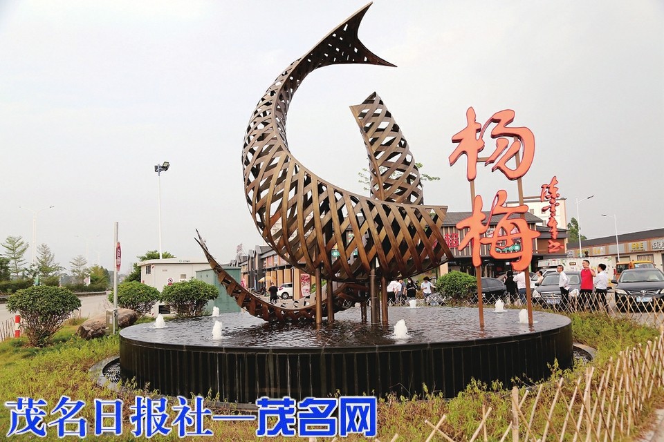 来到徒步路线终点杨梅墟,在入口处可看到,一个圆形喷泉上矗立一座大型罗非鱼特色雕塑和岭南画派名家陈金章题的“杨梅”二字,整个雕塑造型动感十足,形似两条腾跃的罗非鱼,镂空设计又似竹编鱼篓,寓意深刻,更点出杨梅镇是茂名市淡水养鱼第一镇、罗非鱼专业镇的产业特色。走进墟里,街道铺成沥青路,平坦宽阔;商铺、民房风格统一,青瓦白墙,古香古色,韵味十足;路面整洁美观,人来车往。