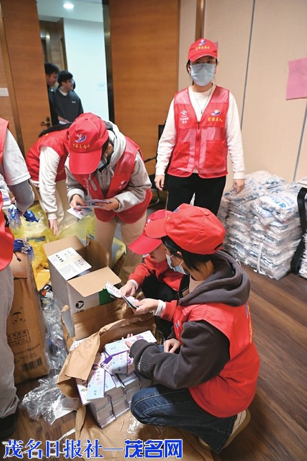 记者在现场看到,除了工作人员,还有几位志愿者正在忙碌着打包、分发,他们各司其职、相互配合,使物资分发秩序井井有条。据悉,她们是来自电白区碧海志愿者服务总队的志愿者,早上8时许便来到电白记者站物资发放点协助工作人员整理、打包物资。