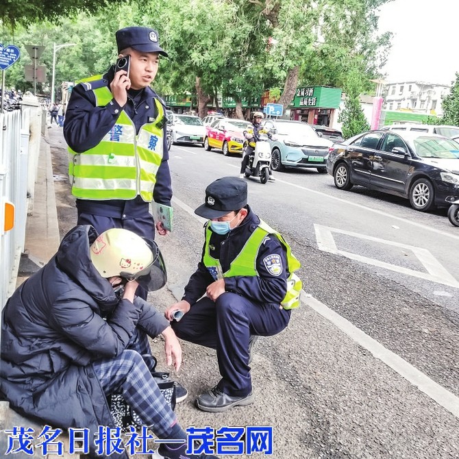 交警将阿姨扶至路边休息。茂名晚报记者李光耀摄