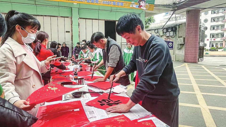 为持续推动主题教育走深走实,弘扬中华传统文化,学校党支部书记、校长带领师生在校门口用心写“福”,用情送“福”,给群众派送用毛笔书写的“福”字,并送上诚挚的新年祝福。