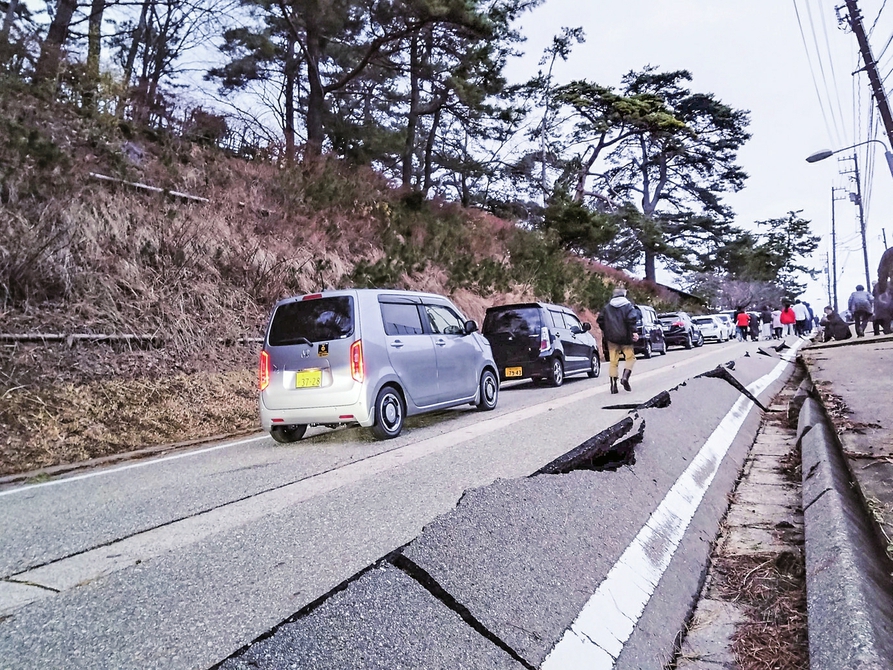 这是1月1日在日本石川县轮岛市河井町拍摄的受损道路。新华社/共同社