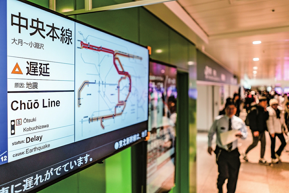 1月1日,在日本东京新宿车站,列车运营时刻表显示列车因地震延误。新华社记者张笑宇摄