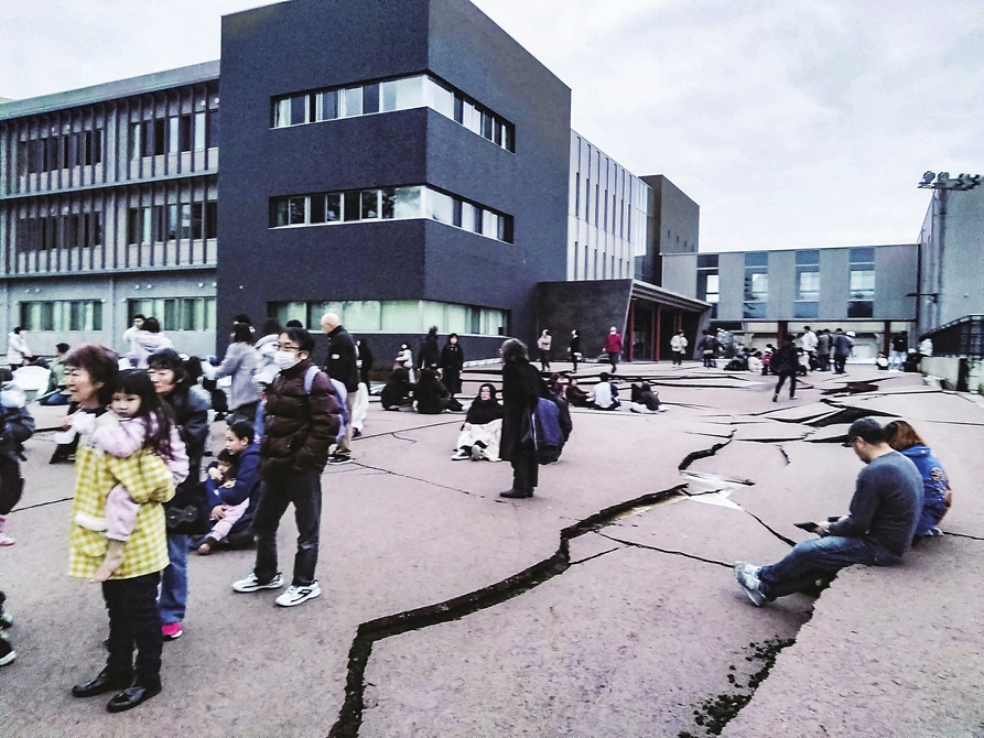 1月1日,在日本石川县轮岛市,人们站在被地震破坏的地面上。 新华社/共同社