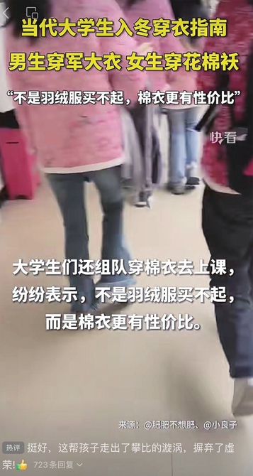 近期,大学生在校园穿军大衣、花棉袄的视频走红网络,不少网友留言评论“为理性消费点赞”“当代年轻人是懂实用性价比的”,“可以买贵的,不能买贵了”已成为许多年轻人的消费共识。在各类社交平台,分享如何理性消费的帖子也会收获年轻网友的回应。