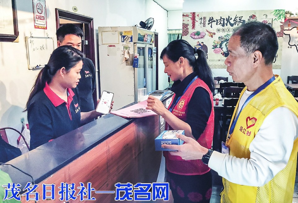 志愿者向商户进行创文问卷调查。 茂名日报社全媒体记者岑稳摄