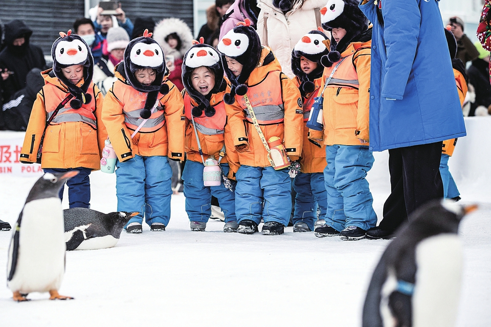 1月6日,11名来自广西南宁的小朋友——“小砂糖橘”结束漠河游学之旅,来到哈尔滨极地公园,与企鹅亲密互动。新华社记者张涛摄
