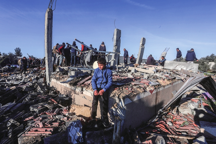 1月7日,在加沙地带南部城市拉法,一名男孩坐在以军空袭后的废墟上。新华社发(哈立德·奥马尔摄)