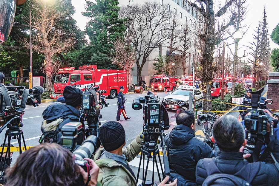 1月8日,媒体记者在日本前首相田中角荣位于东京的旧宅前做报道。新华社记者张笑宇摄