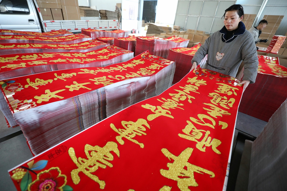 1月9日,温县赵堡镇赵堡村的村民在整理春联。随着春节的临近,河南省焦作市温县赵堡镇赵堡村迎来春联产销旺季,村民们赶制春联,供应各地市场。 新华社发(徐宏星摄)