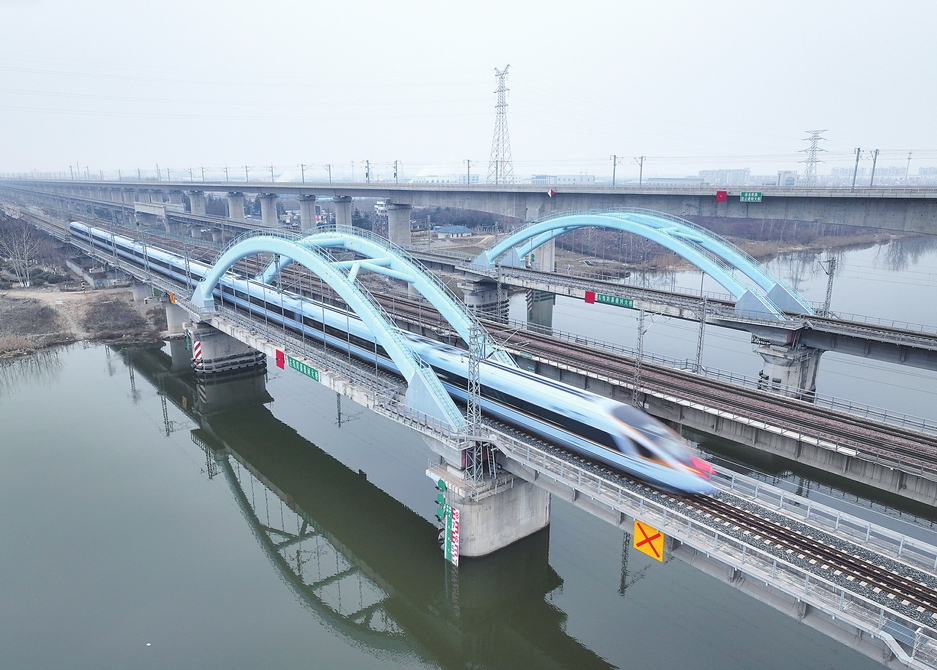 1月9日,列车驶过江苏省连云港市海州区境内的一座铁路桥(无人机照片)。新华社发(王春摄)