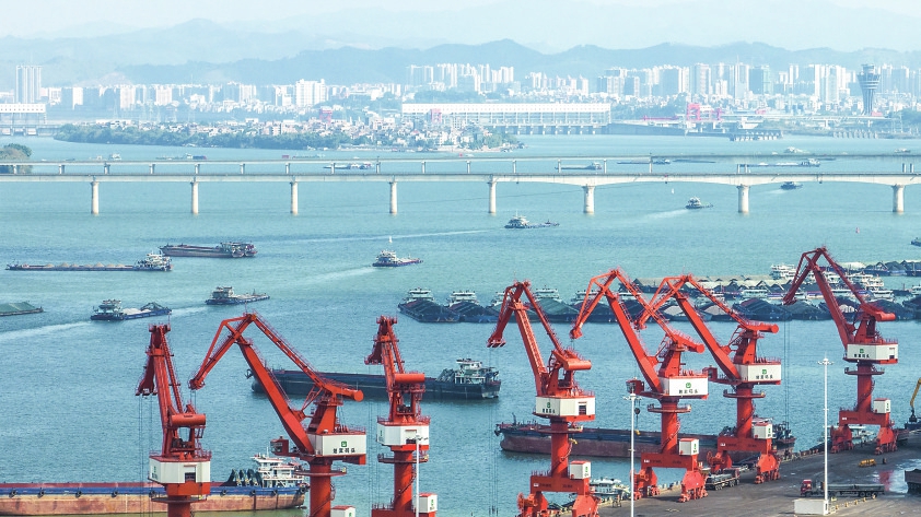 1月3日,在广西梧州临港经济区赤水港码头,工人操作设备在码头上进行装卸作业(无人机照片)。 新华社发(何华文摄)