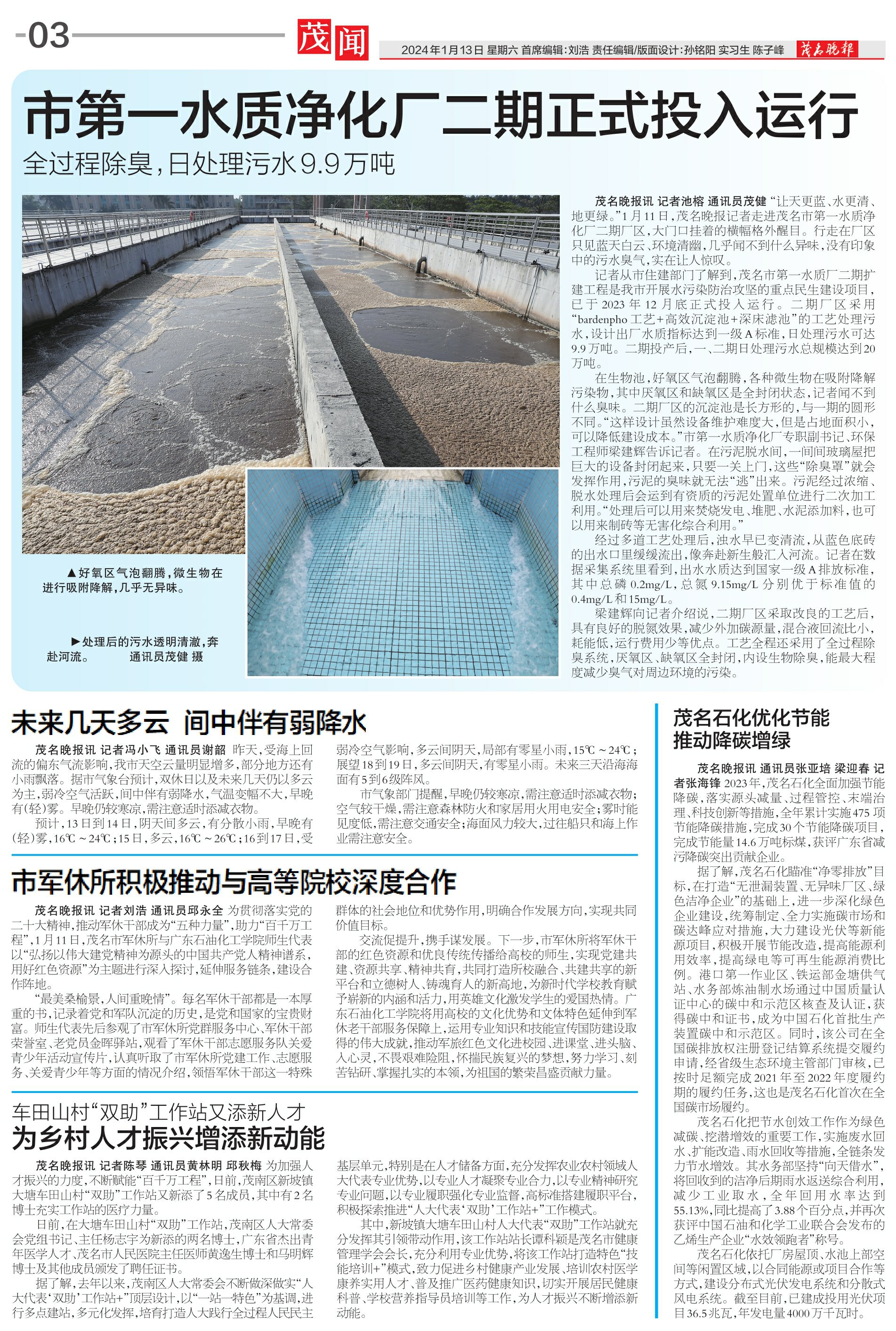 茂名石化把节水创效工作作为绿色减碳、挖潜增效的重要工作,实施废水回水、扩能改造、雨水回收等措施,全链条发力节水增效。其水务部坚持“向天借水”,将回收到的洁净后期雨水返送综合利用,减少工业取水,全年回用水率达到55.13%,同比提高了3.88个百分点,并再次获评中国石油和化学工业联合会发布的乙烯生产企业“水效领跑者”称号。