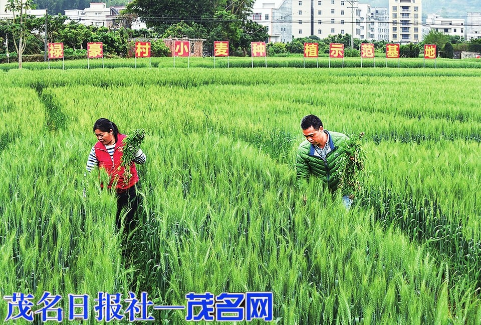 村干部与村民在处理麦田杂草。茂名日报社全媒体记者甘杨松摄