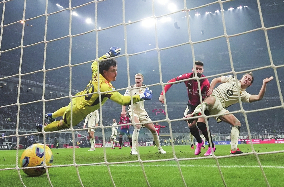 1月14日,AC米兰队球员吉鲁(右二)在比赛中射门得分。新华社发(阿尔贝托·林格利亚摄)