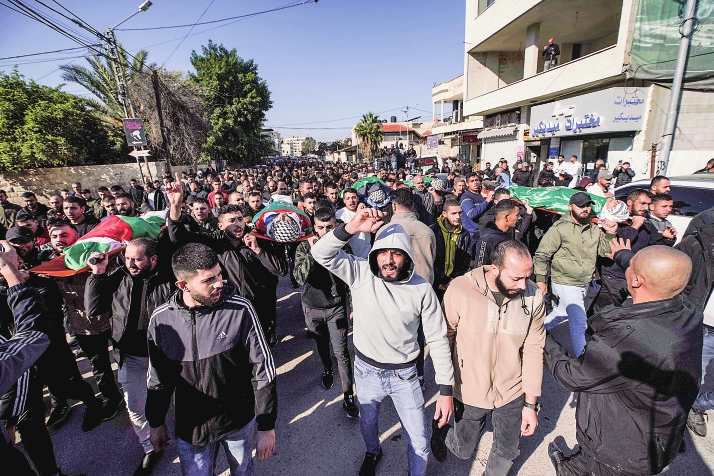 1月7日,在约旦河西岸城市杰宁,人们参加被打死的巴勒斯坦人的葬礼。新华社发(艾曼·诺巴尼摄)