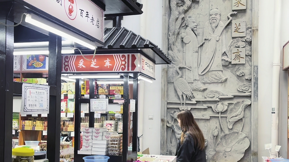 顾客在苏州山塘街上的采芝斋挑选商品。