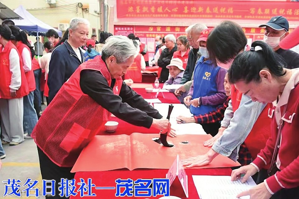 茂名晚报讯记者黄宇彬 1月19日下午,由茂名市文化广电旅游体育局、茂南区官渡街道坡咀社区新时代文明实践站主办,茂名市书画院承办的茂名市文明实践集中活动日结对共建活动之“浓墨飘香暖人心喜迎新春送祝福——写春联送祝福活动”在官渡街道坡咀社区举办。茂名市书画院组织15名书法家参加活动。