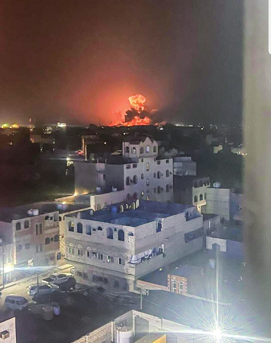 这是1月12日在也门首都萨那拍摄的空袭后的爆炸画面(手机照片)。新华社发