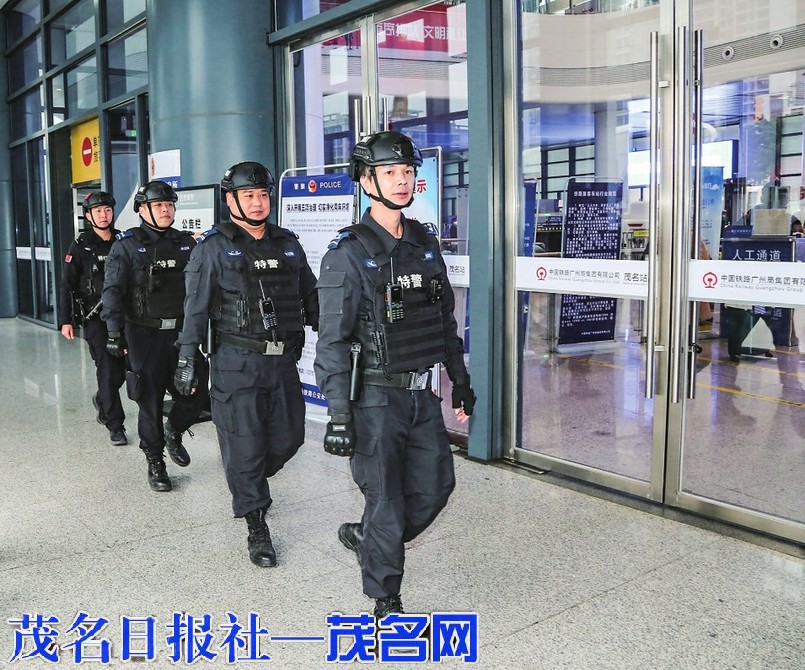 特警在车站巡逻确保春运安全。茂名日报社全媒体记者李颜东摄
