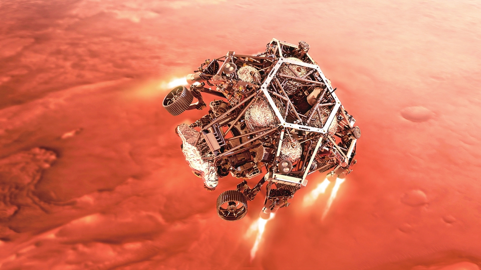 2021年2月18日,美国“毅力”号火星车在火星成功着陆。这张示意图显示“毅力”号在火星着陆过程。新华社发(美国航天局供图)