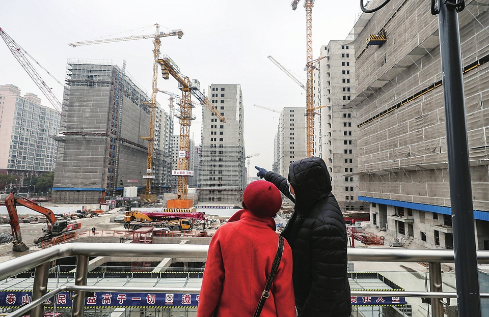1月10日,两位市民在彭浦新村地铁站出站天桥上观看一建设工地。 新华社记者方喆摄