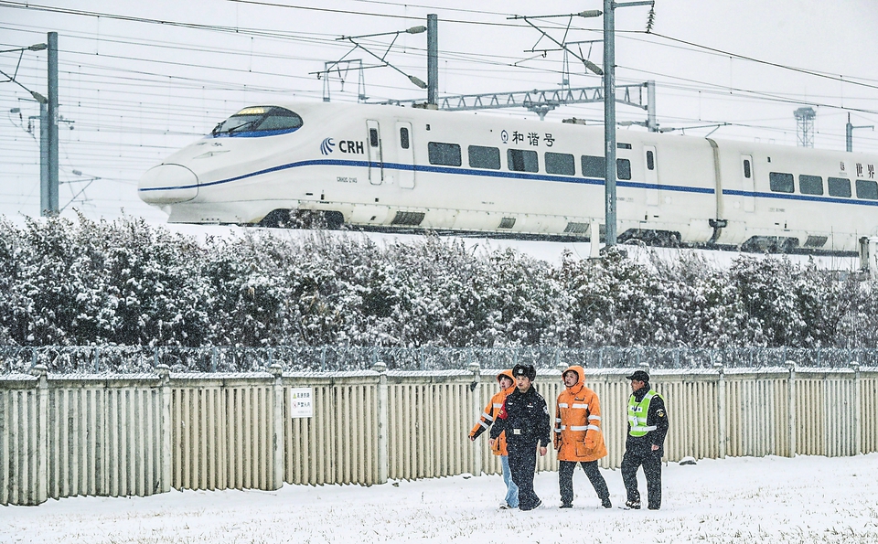 2月4日,铁路公安民警和高铁基础设施线路工在江苏淮安东站线路段巡查。新华社发(赵启瑞摄)