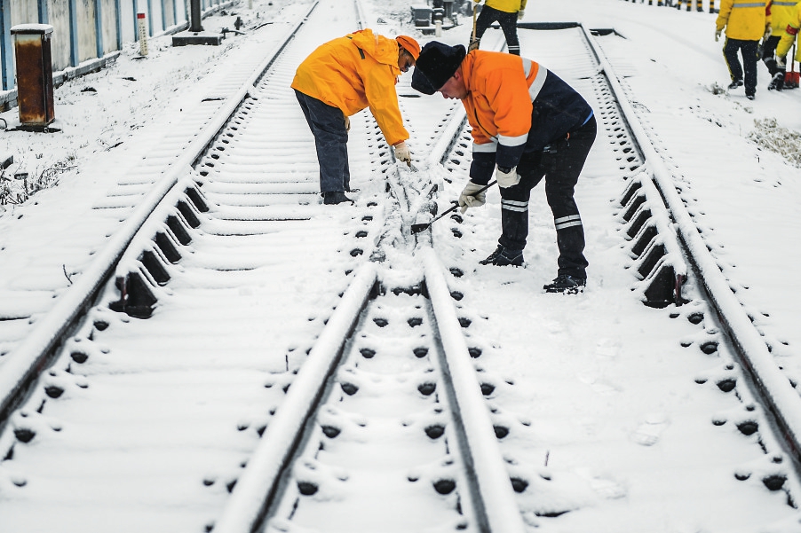 2月4日,武汉高铁工务段工人在清扫轨道上的冰雪。新华社记者杜子璇摄