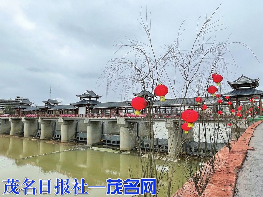 记者从现场摆放的工程概况介绍得知,现放眼望去的廊桥美景,是高山拦河闸坝重建工程,位于茂名市茂南区茂化快线桥上游约80米。水闸设计防洪标准为100年一遇,设计洪峰流量为每秒1658立方米,为II等大(2)型水闸,主要建筑物级别为2级。水闸的主要功能为拦蓄河道景观水面,并利用闸上部廊桥连通两岸滨水步道等。水闸闸型为升卧式平板钢闸门,闸底板高程5.0米,蓄水高程8.4米,共布置8孔闸门,单孔闸门净尺寸为12.0×3.4米。