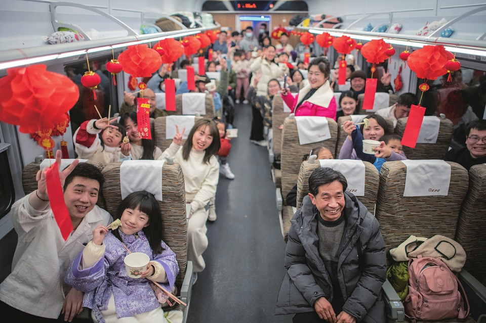 2月9日,在D3838次列车上次列车上,,武汉客运段汉口城际动车组车间“凤舞楚天”乘务组为乘客发放饺子,大家一起吃饺子过除夕。新华社记者伍志尊摄