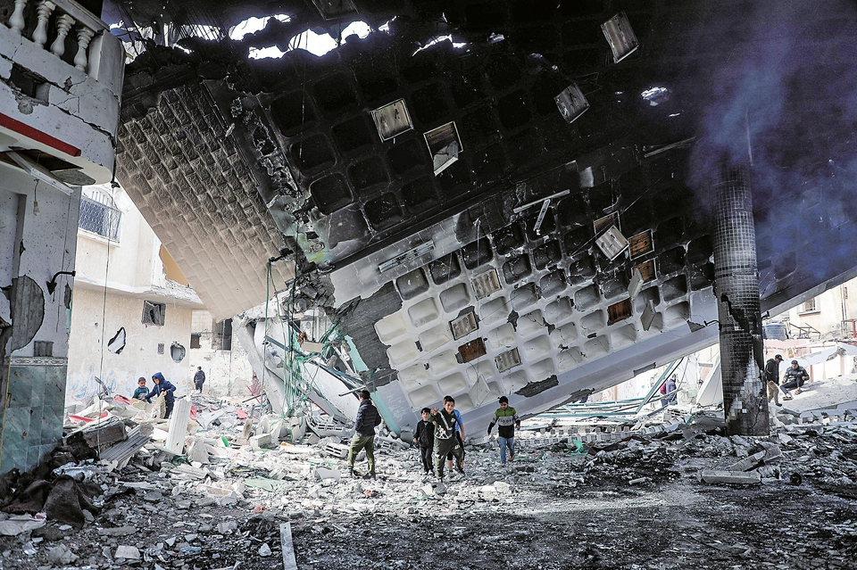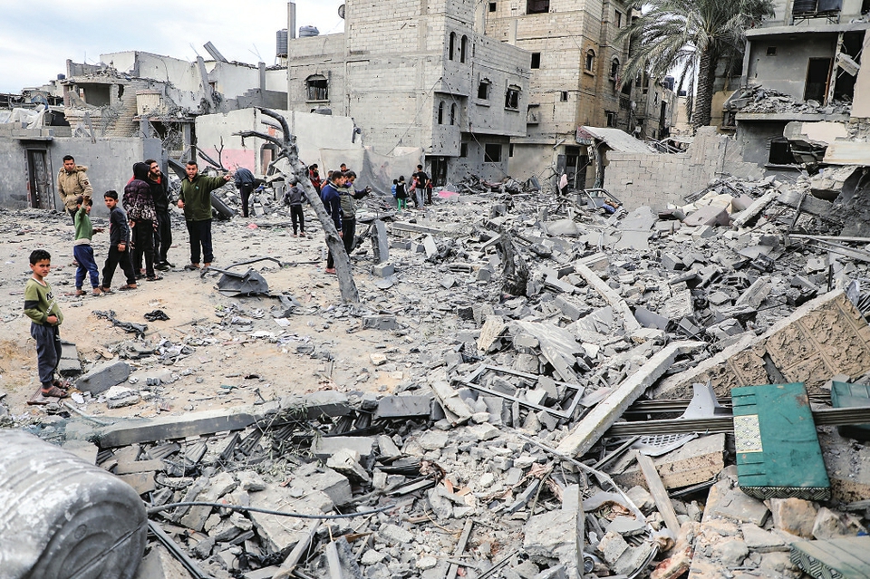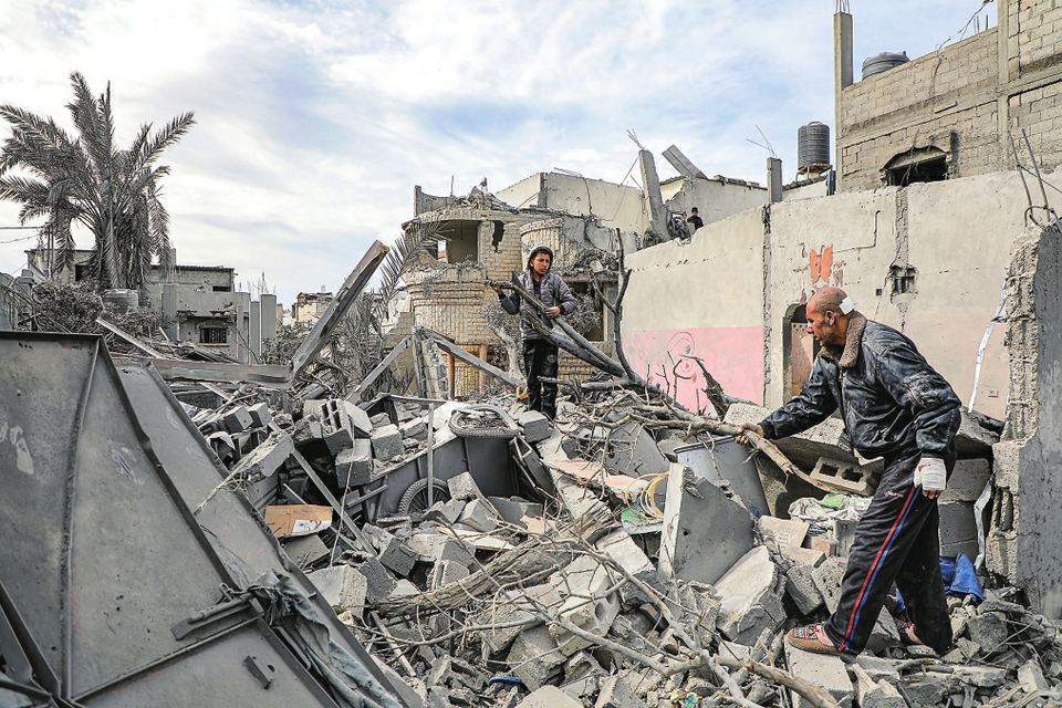 2月12日,人们在加沙地带南部城市拉法查看建筑残骸。新华社发(里泽克·阿卜杜勒贾瓦德摄)