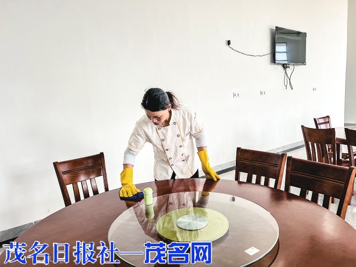 梁友珍在清洁食堂卫生。