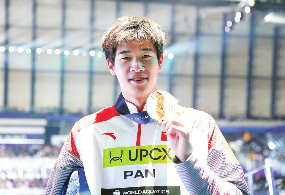 2月15日,冠军中国选手潘展乐在颁奖仪式后留影。 当日,在卡塔尔多哈举行的2024年世界游泳锦标赛游泳项目男子100米自由泳决赛中,中国选手潘展乐以47秒53的成绩夺得冠军。 新华社记者雒圆摄