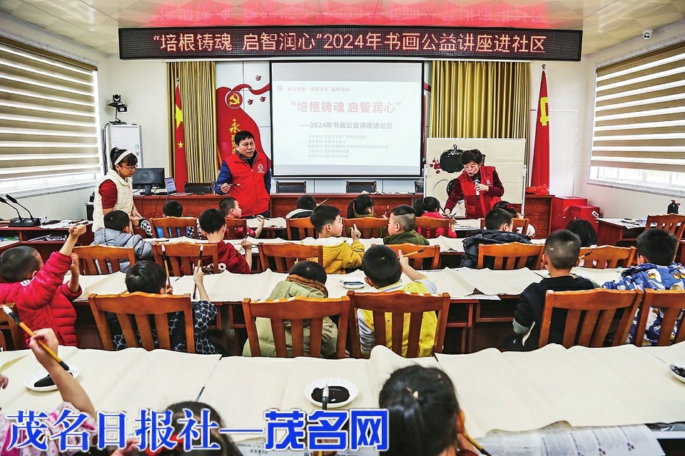 茂名晚报讯记者和沛蓉前日下午,由茂名市文化广电旅游体育局主办、茂名市书画院承办的“好心文化·追梦少年”品牌系列活动之“培根铸魂启智润心”2024年书画公益讲座走进河东街道岭咀社区,旨在激发孩子们对学习书画的兴趣,提高孩子们的书画审美能力,以及加强孩子们对传统文化的认识,让孩子们从中感受传统文化的魅力。社区快乐童年幼儿园大班儿童参加讲堂。