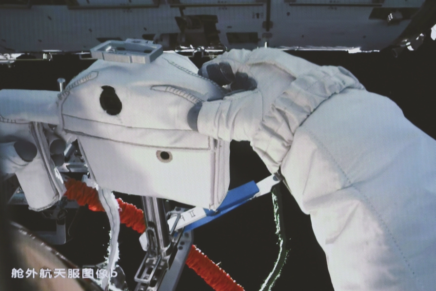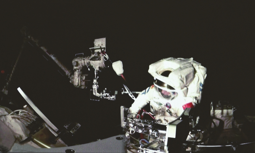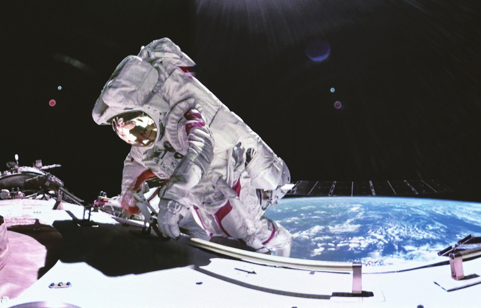 3月2日,在北京航天飞行控制中心拍摄的神舟十七号航天员汤洪波在空间站组合体舱外作业。