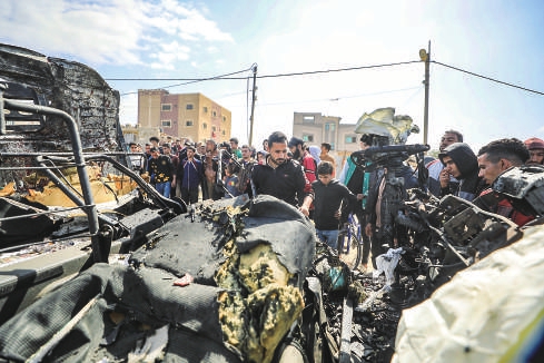 3月3日,在加沙地带中部城市代尔拜拉赫,人们查看遭以军袭击的卡车。 新华社发(亚西尔·库迪摄)