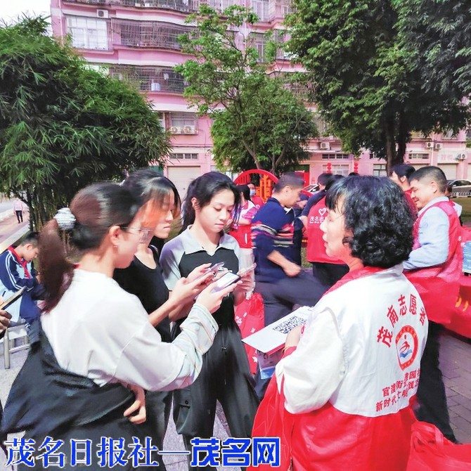 据记者观察,除官渡街道雅园社区新时代文明实践志愿者外,还有茂名市园林事务中心志愿者,展翼志愿者,茂名市荧光服务队,茂名供销社志愿者,茂名市人民医院志愿者,茂名城管志愿者等多个志愿都团队超60人陆续到场。晚上7时,志愿者们分成9个组,拿上创文宣传资料深入居民家中进行宣传,给居民发放宣传资料、引导居民通过扫描二维码,填写调查问卷。