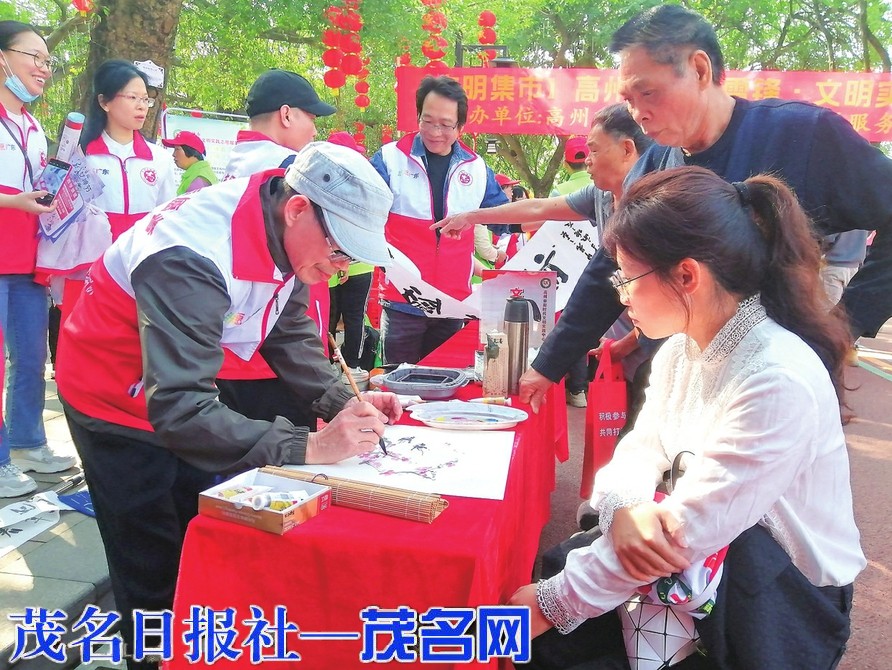 茂名晚报讯通讯员黄诒高冯章 3月5日,是学雷锋纪念日。当天上午,在高州市潘州公园,大批志愿者在此开展系列活动,其中一个服务点引人注目,那就是来自高州写生学会的文化志愿者们忙着为市民书写和作画。