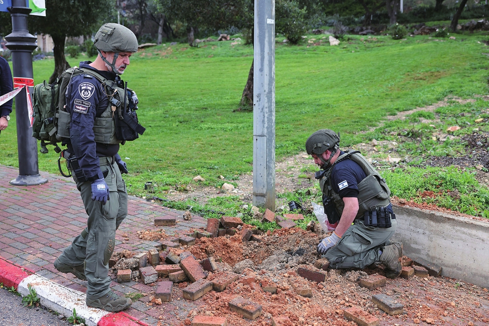 2月14日,以色列安全部队人员在采法特勘察火箭弹袭击现场。新华社发(大卫·科恩摄/基尼图片社)
