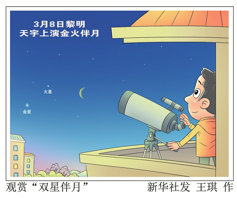 新华社天津3月6日电(记者周润健)3月8日黎明时分,金星、火星和一弯细细的残月将在东南方低空短暂“欢聚”,届时如果天气晴好,感兴趣且能早起的公众可尝试观赏这幕“双星伴月”。