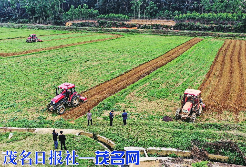 在化州市笪桥镇大沙田村,大型农耕机械在进行春耕备耕作业。
