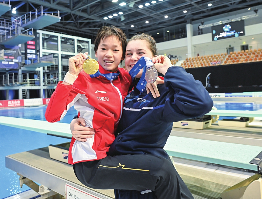 3月24日,冠军中国选手全红婵(左)和亚军英国选手斯彭多利尼·西里埃在颁奖仪式后合影。 新华社记者任鹏飞摄