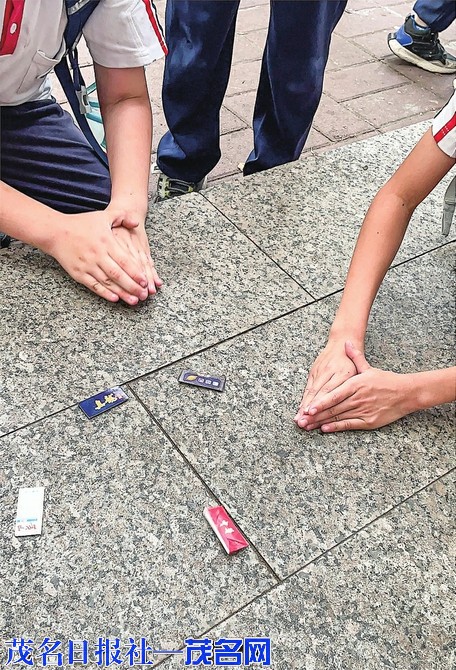 下午放学时分,小学学校周边的围墙下,几个小学生围成一圈,地上摆放着几个五颜六色的长方形“卡片”,孩子们经过猜拳,胜出者双手合拢,以空掌心击拍地面,利用掌风把卡片翻了个面,这代表着他赢得了该枚卡片,随后其将卡片收入了盒中。该游戏类似上世纪80、90年代的拍洋画,但值得注意的是,这些小学生的“卡片”却是香烟盒顶盖的厚纸张折叠而成,因此被叫做“烟卡”。最近,这种“烟卡”在部分小学生当中被当成新的“玩具”。家长、学校对此有何看法?茂名晚报记者进行了走访调查。