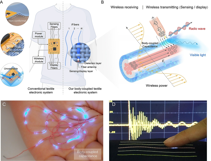 东华大学材料科学与工程学院先进功能材料课题组在一次实验中,偶然发现纤维在无线电场中发出了光。以此为基础,课题组开创性地提出“非冯·诺依曼架构”的新型智能纤维,实现了将能量采集、信息感知与传输等功能集成于单根纤维中。