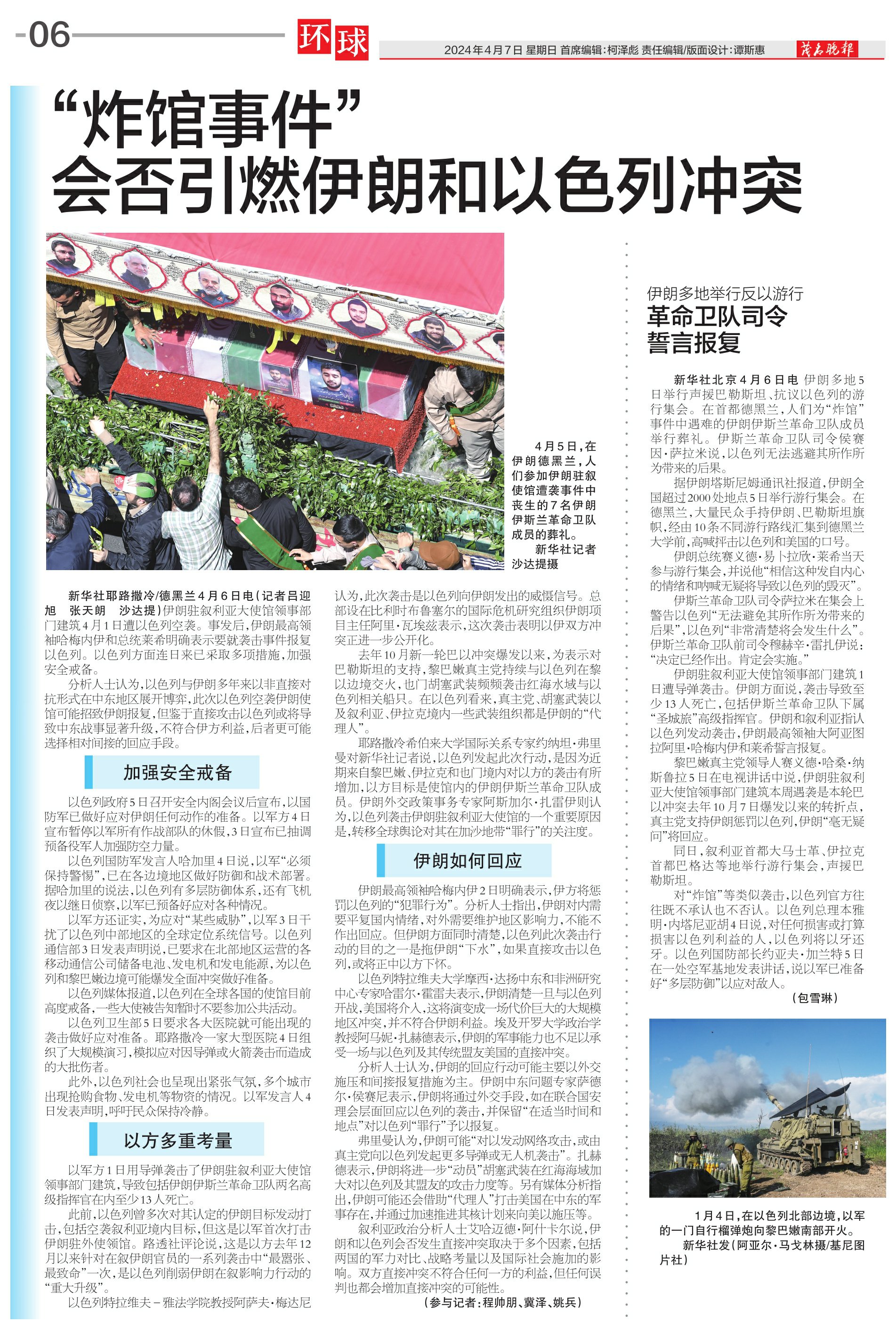 新华社北京4月6日电 伊朗多地5日举行声援巴勒斯坦、抗议以色列的游行集会。在首都德黑兰,人们为“炸馆”事件中遇难的伊朗伊斯兰革命卫队成员举行葬礼。伊斯兰革命卫队司令侯赛因·萨拉米说,以色列无法逃避其所作所为带来的后果。