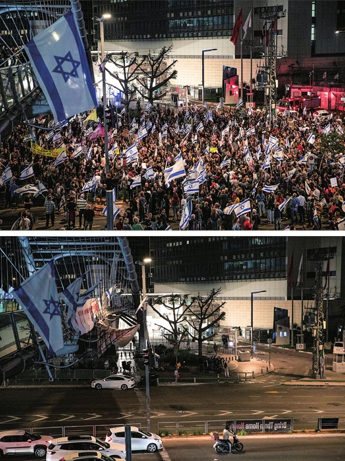 上图:4月13日晚,在以色列特拉维夫的以色列国防部前,民众在安全警告生效前举行示威集会;下图:4月13日晚,在以色列特拉维夫的以色列国防部前参加示威集会的民众在安全警告生效后散去。 新华社记者陈君清摄