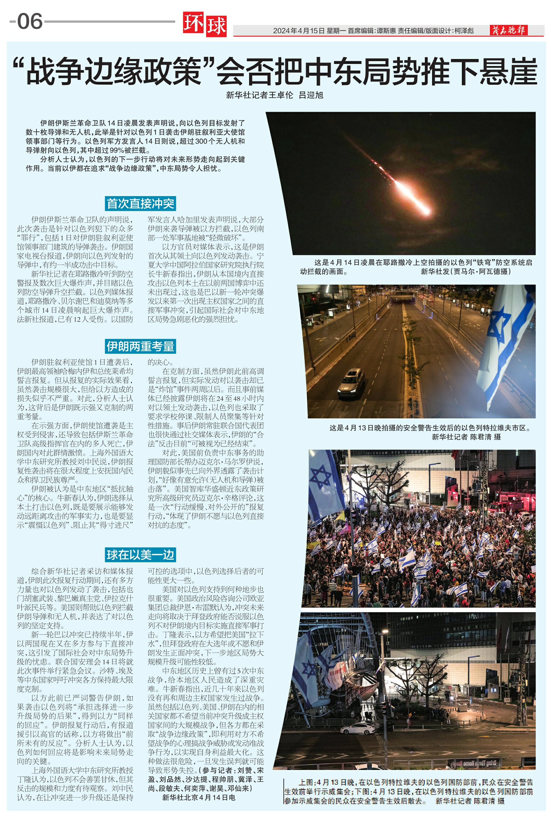 中东地区历史上曾有过5次中东战争,给本地区人民造成了深重灾难。牛新春指出,近几十年来以色列没有再和周边主权国家发生过战争。虽然包括以色列、美国、伊朗在内的相关国家都不希望当前冲突升级成主权国家间的大规模战争,但各方都在采取“战争边缘政策”,即利用对方不希望战争的心理搞战争威胁或发动准战争行为,以实现自身利益最大化。这种做法很危险,一旦发生误判就可能导致形势失控。(参与记者:刘赞、宋盈、刘品然、沙达提、程帅朋、冀泽、王尚、段敏夫、何奕萍、谢昊、邓仙来)